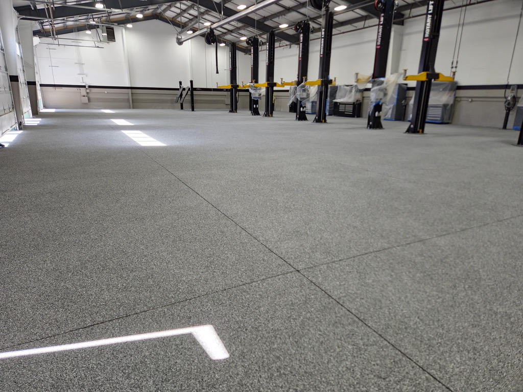 Shop floor went from beat-up concrete to a clean, durable flake finish. Strong enough for forklifts, tools, whatever you throw at it.